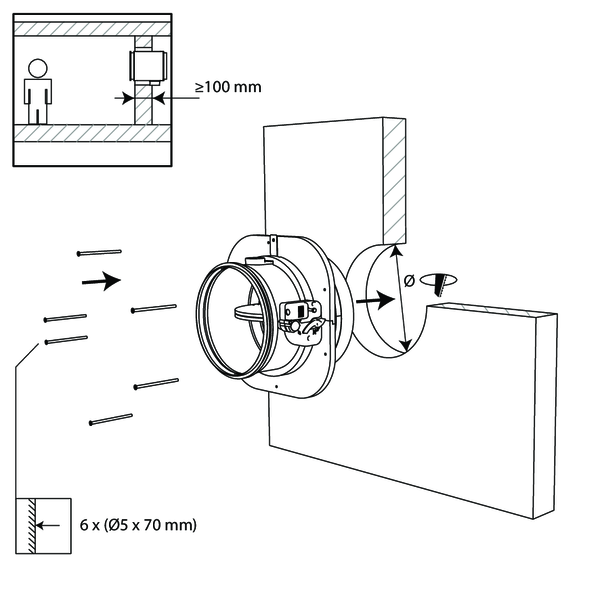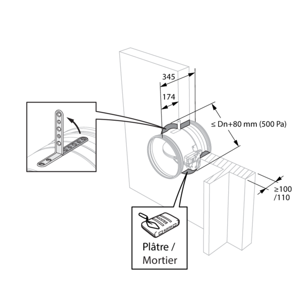 - Béton cellulaire / béton (armé) ≥ 100 mm | EI 120 (ve i o) S - (500 Pa) | Plâtre | Type de pose : encastré, 0-360°. Distances minimales autorisées avec axe jusqu'à 45°. | Ø 100-315 mm