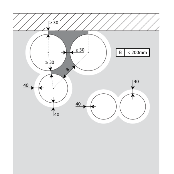 Attention : la réservation est colmatée selon le classement existant (voir point suivant) dans le cas où : - 2 clapets coupe-feu sont placés à distance minimale l’un de l’autre mais à distance normale (≥ 75 mm) des parois. - Un seul clapet coupe-feu est placé à distance minimale (≤ 75 mm) d’une paroi ou d’une dalle.