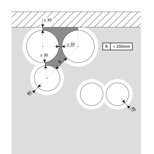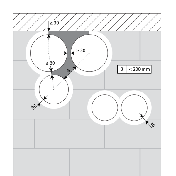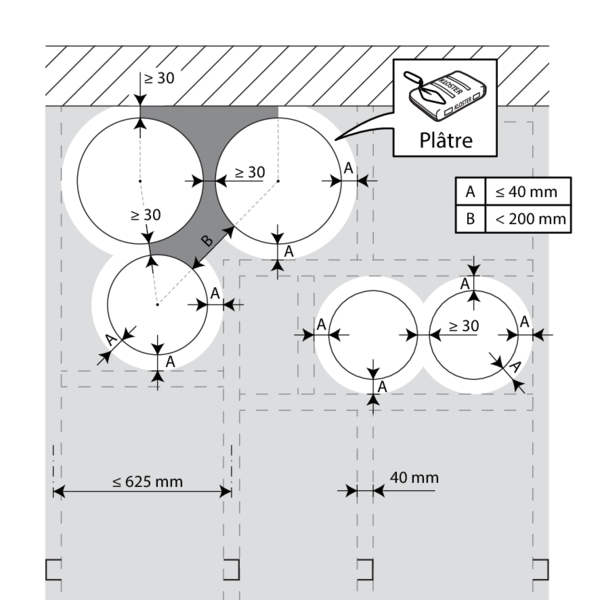 Attention : la réservation est colmatée selon le classement existant (voir point suivant) dans le cas où : - 2 clapets coupe-feu sont placés à distance minimale l’un de l’autre mais à distance normale (≥ 75 mm) des parois. - Un seul clapet coupe-feu est placé à distance minimale (≤ 75 mm) d’une paroi ou d’une dalle.