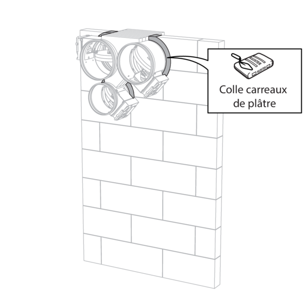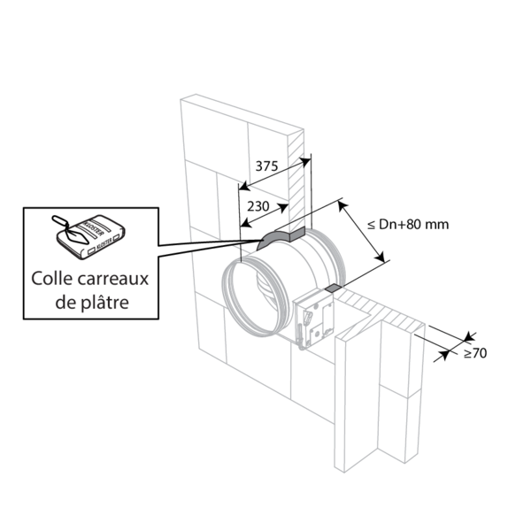 - Carreaux de plâtre ≥ 70 mm | EI 120 (ve i o) S - (500 Pa) | Colle carreaux de plâtre | Type de pose : encastré, 0-360°. Distances minimales autorisées avec axe jusqu'à 45°. | Ø 200-630 mm