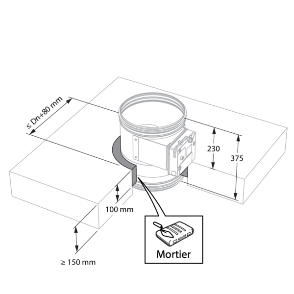 - Béton cellulaire / béton (armé) ≥ 150 mm | EI 120 (ho i o) S - (500 Pa) | Mortier | Type de pose : encastré, 0-360°. Distances minimales autorisées. | Ø 200-630 mm