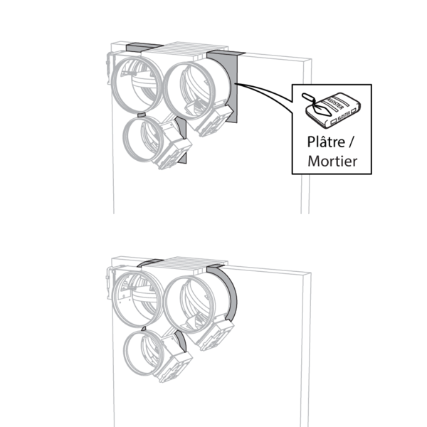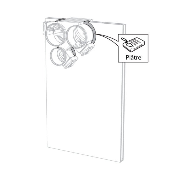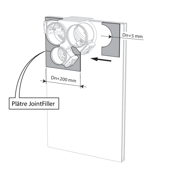 Dans la réservation autour des clapets, le vide entre les plaques de plâtre est partiellement rempli (jusque Dn + 80 mm) de laine de roche d’une densité minimale de 40 kg/m³.