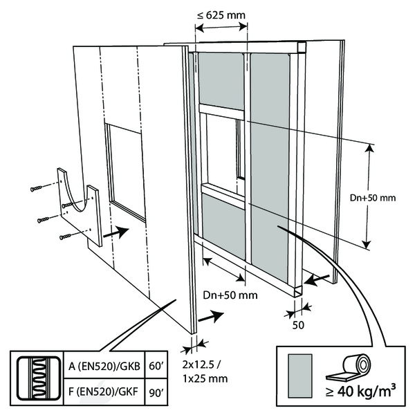 Dans la réservation autour des clapets (Dn + 50 mm), le vide entre les plaques de plâtre cartonné est rempli de laine de roche d’une densité minimale de 40 kg/m³.