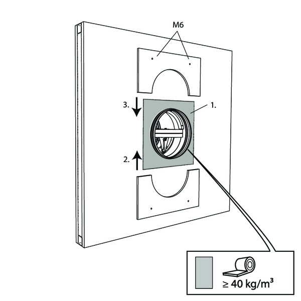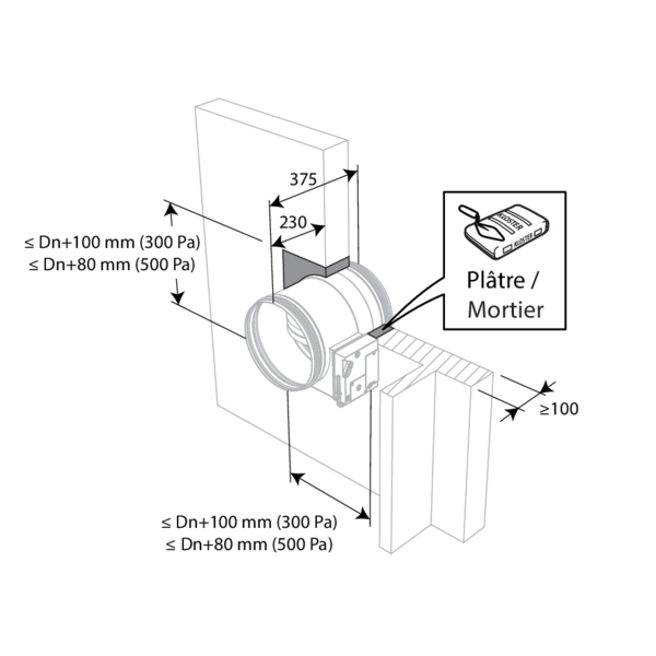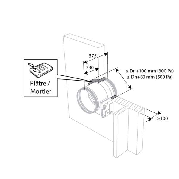 - Béton cellulaire / béton (armé) ≥ 100 mm | EI 120 (ve i o) S - (500 Pa) | Mortier / Plâtre | Type de pose : encastré, 0-360°. Distances minimales autorisées avec axe jusqu'à 45°. | Ø 200-630 mm