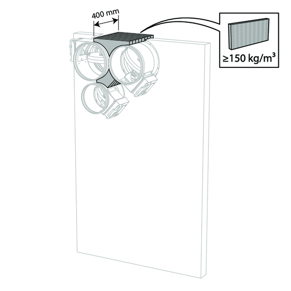 Colmatez la réservation du côté des distances minimales à l’aide de panneaux rigides de laine de roche (≥ 150 kg/m³) sur une profondeur de 400 mm (150 mm du côté mécanique de la paroi).
