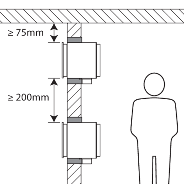 - Respectez les distances de sécurité par rapport aux autres éléments constructifs. Le mécanisme de déclenchement doit également rester accessible : prévoyez pour cela un espace libre de 200 mm autour du boîtier.