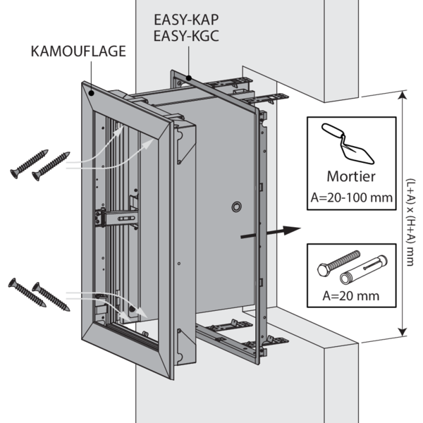 Faites une baie aux dimensions (L+A) x (H+A) mm. A = 2 x épaisseur manchon (e) + 20 mm.