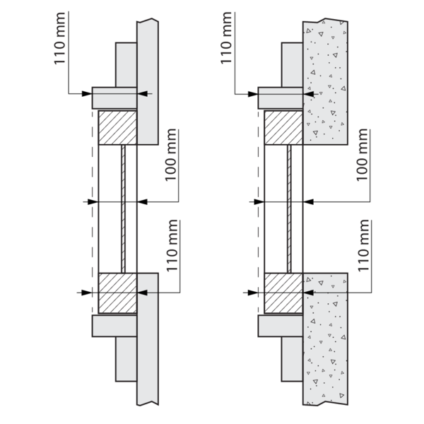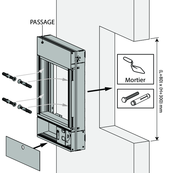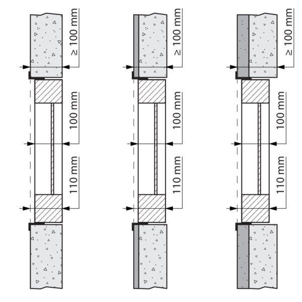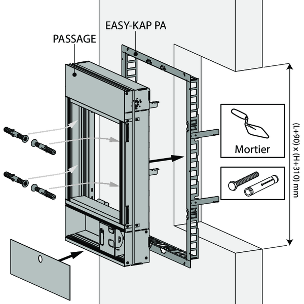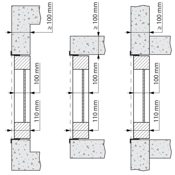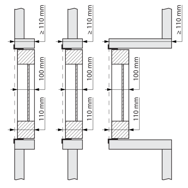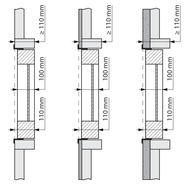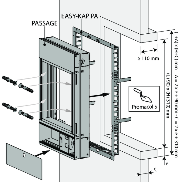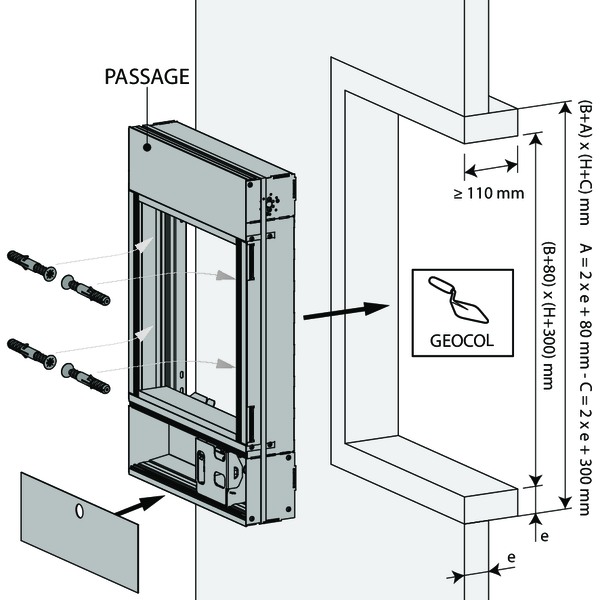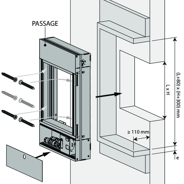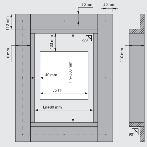 Prévoyez un manchon de montage en matériau du conduit autour du vantail avec des dimensions intérieures : (Ln + 80) x (Hn + 300) mm et profondeur d'installation: 110 mm.