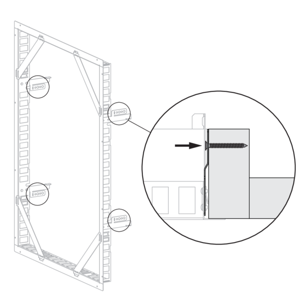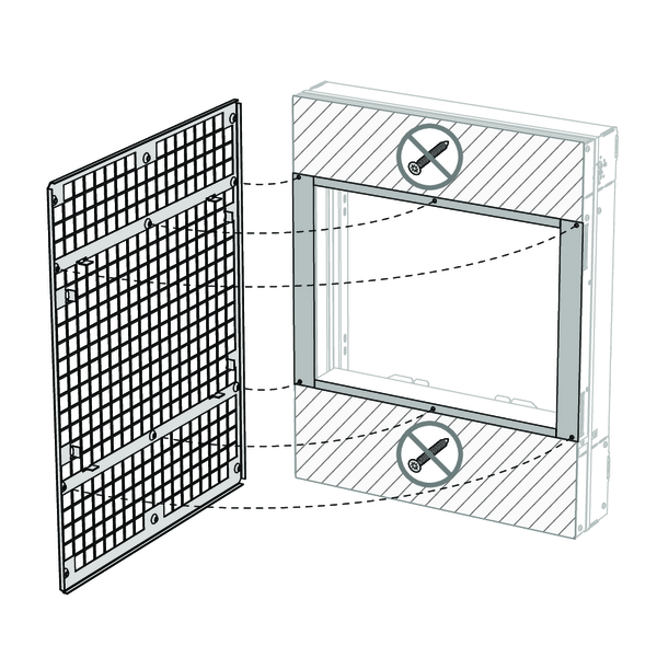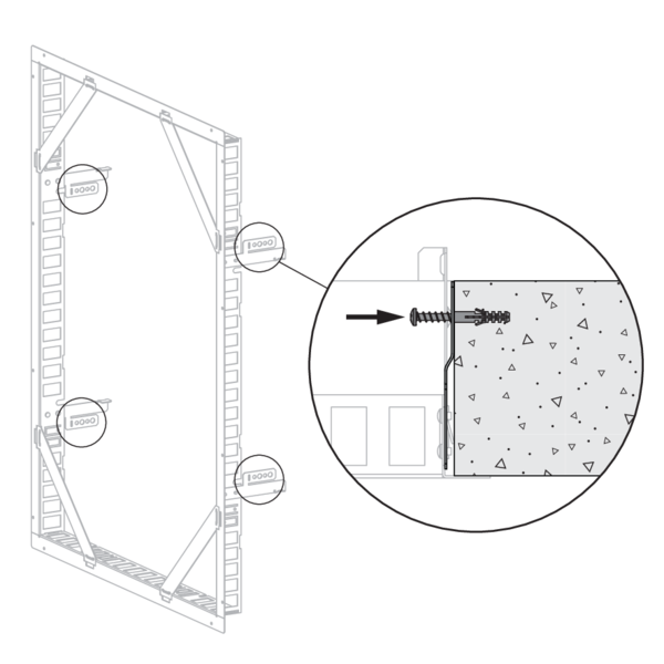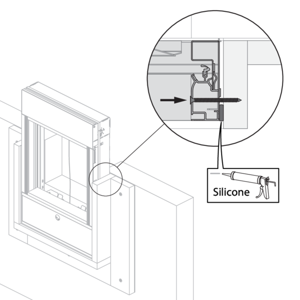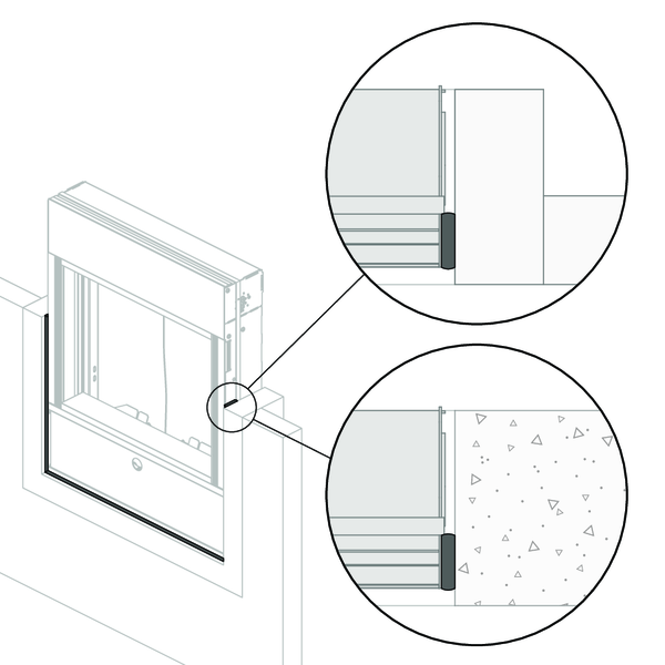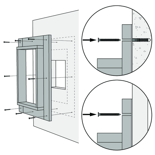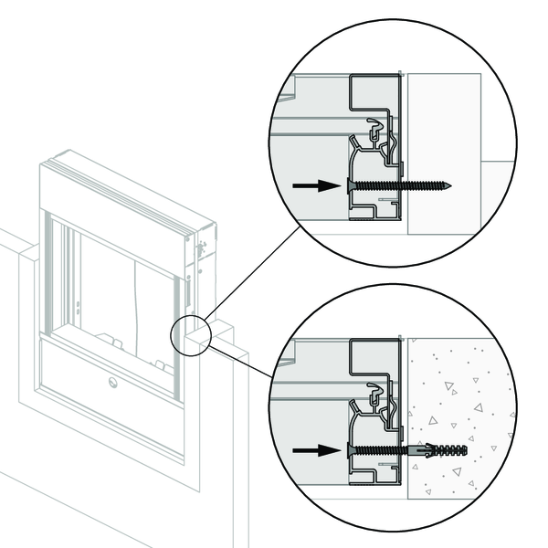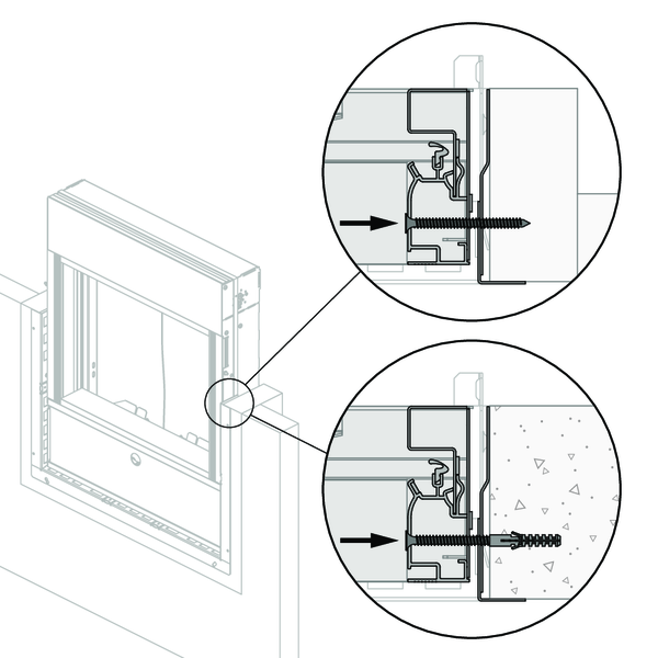 Le précadre doit toujours être fixé sur le conduit en béton à l’aide de vis et de chevilles. Utilisez pour cela des vis Ø4 x minimum 30 mm, en acier ou en acier inoxydable.