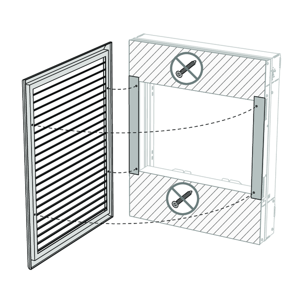 Placez le volet dans la réservation. Vissez le volet dans les deux profils latéraux avec les vis Ø 6 x 70 mm fournies, en respectant un pas minimal de 300 mm. Veillez à ne pas déformer le volet lors du vissage.