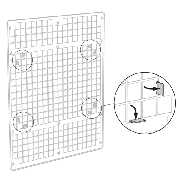 Tournez les quatre plaques de fixation sur le précadre à 90° en position verticale et fixez-les à l’aide des rivets à frapper fournis.