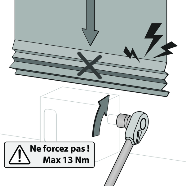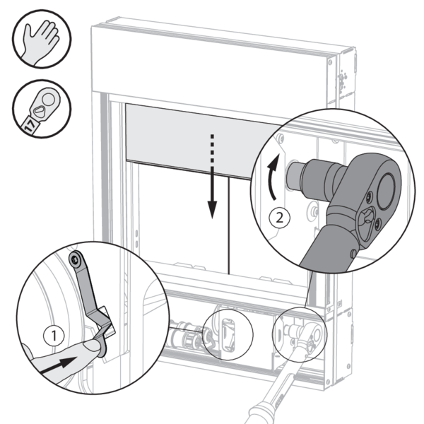Placez une clé dynamométrique numéro 17 sur l’écrou. Appuyez le ressort de sécurité tout en tendant le rideau. Tournez dans le sens des aiguilles d’une montre pour tirer le rideau vers le bas.