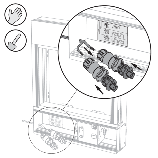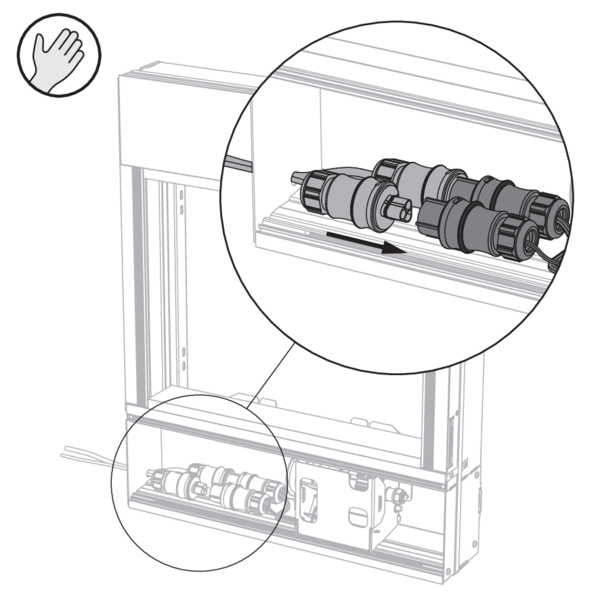 Avant d’installer le PASSAGE, ouvrez la trappe d’accès et vérifiez qu’il y ait une réservation adéquate dans le profil latéral, en bas à gauche, afin de permettre le passage du câble entrant.