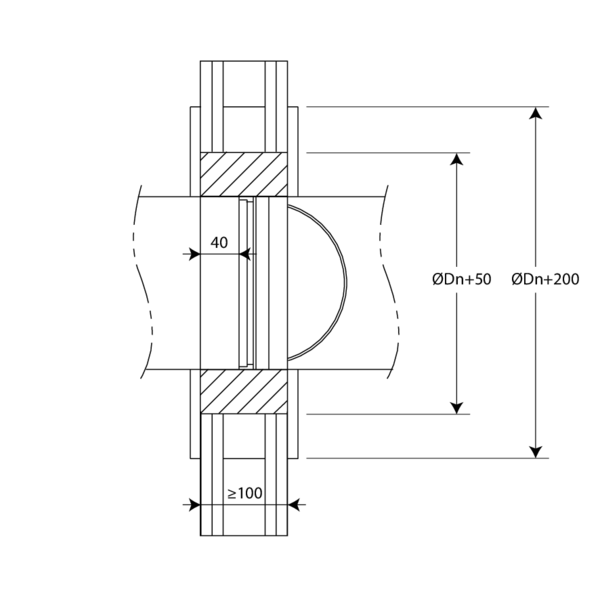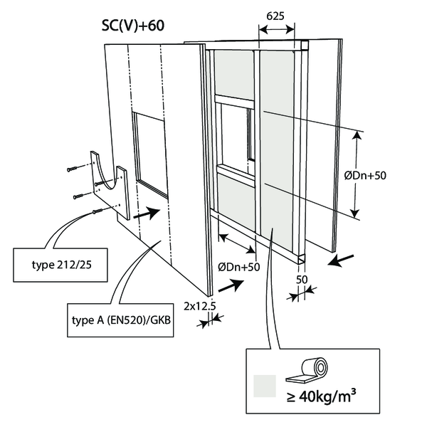 - Pannello di cartongesso con telaio metallico tipo A (EN 520) ≥ 100 mm | EI 60 (ve i o) S - (300Pa) | Lana di roccia + rivestimento ≥ 140 kg/m³ | Tipo di installazione: a incasso all'interno di un canale, 0-360°. Distanze minime autorizzate. | SC+60 Ø 100-200 mm