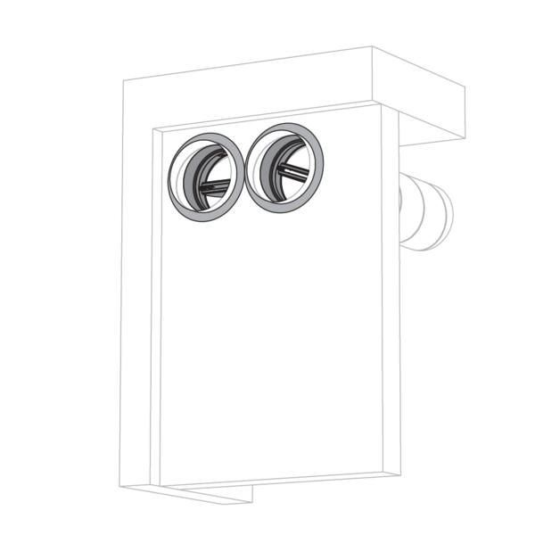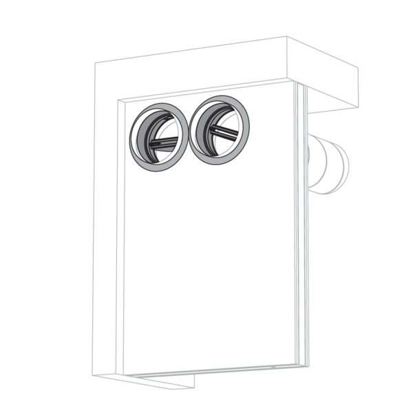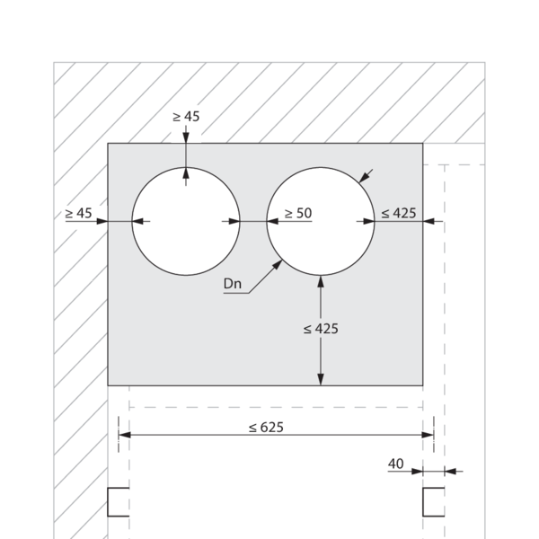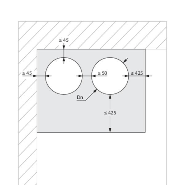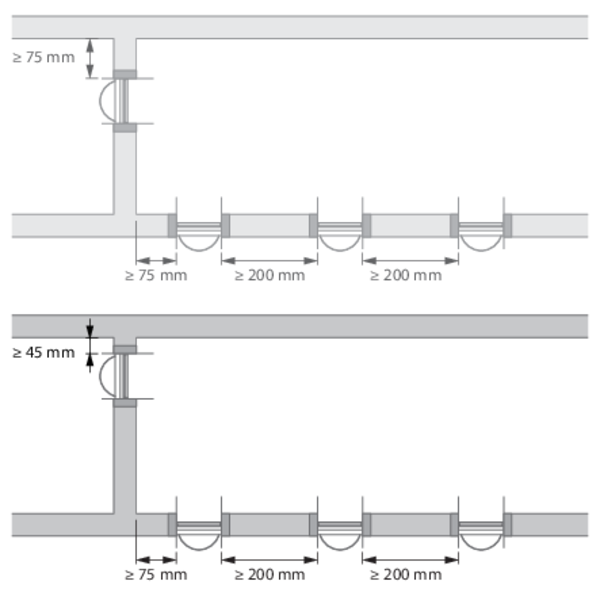Secondo gli standard di prova europei, una serranda antincendio deve essere installata ad una distanza minima di 75 mm dalla parete adiacente e a 200 mm da un'altra serranda, a meno che la soluzione non sia stata testata per una distanza minore. Questa gamma di serrande tagliafuoco Rf-t è stata testata con successo e può essere installata in un telaio di supporto verticale ad una distanza inferiore al valore minimo stabilito dagli standard in alcune situazioni di installazione - vedi oltre.