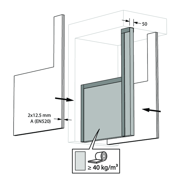 L'apertura nella parete intorno al canale isolato viene sigillata con 2 lastre rigide di lana di roccia da 50 mm con rivestimento ignifugo su un lato (tipo Promastop CB50 / Hilti CFS-CT B).