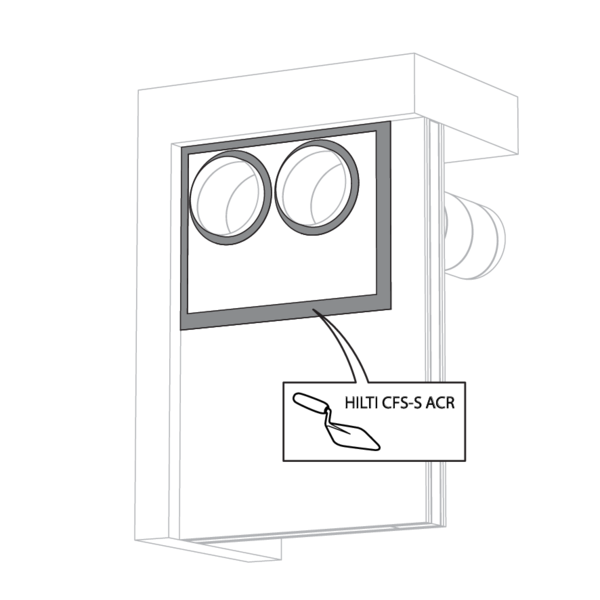 L'apertura nella parete attorno al canale di ventilazione in cui è montata la cartuccia della serranda tagliafuoco è sigillata con 2 strati di pannelli di lana di roccia spessi 50 mm, con rivestimento resistente al fuoco su un lato (tipo HILTI CFS-CT B).