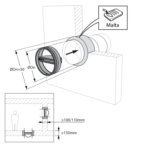 - Calcestruzzo aerato ≥ 100 mm | EI 60 (ve i o) S - (300Pa) | Malta | Tipo di installazione: a incasso all'interno di un canale, 0-360° | SC+60 Ø 100-200 mm