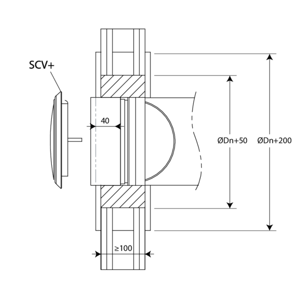 - Calcestruzzo aerato ≥ 100 mm | EI 60 (ve i o) S - (300Pa) | Malta | Tipo di installazione: a incasso all'interno di un canale, 0-360° | SCV+60 Ø 100-200 mm