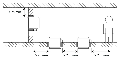 Wanneer de wand door verschillende leidingen wordt doorkruist (kabels, PVC, HVAC…), dan moet er minstens 200 mm afstand zijn tussen de afdichting van de brandklep en de andere technieken, tenzij anders getest (een specifieke testnorm is in voorbereiding).