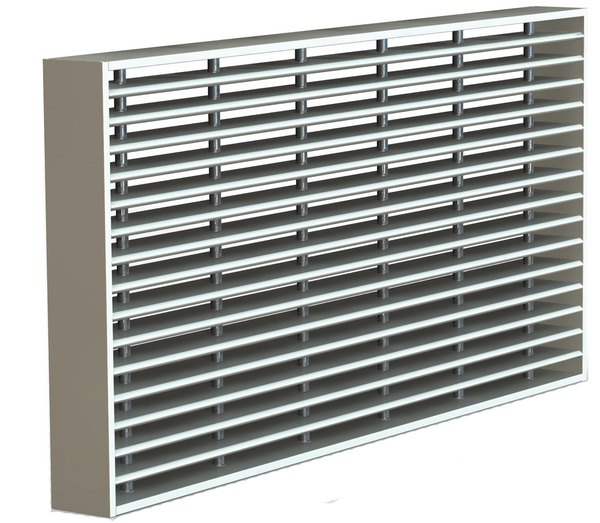 Rechthoekig doorkijkrooster met een brandweerstand van 60 minuten in massieve wand. Door hun neutraal aspect zijn deze roosters bij uitstek geschikt voor de natuurlijke ventilatie van technische lokalen.