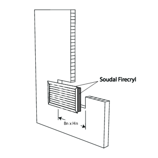 - Cellenbeton ≥ 100 mm | EI 60 (ve i o) | Soudal Firecryl | Installatiemethode: ingebouwd, met lamellen horizontaal | 100x100 mm ≤ GZ60 ≤ 800x400 mm