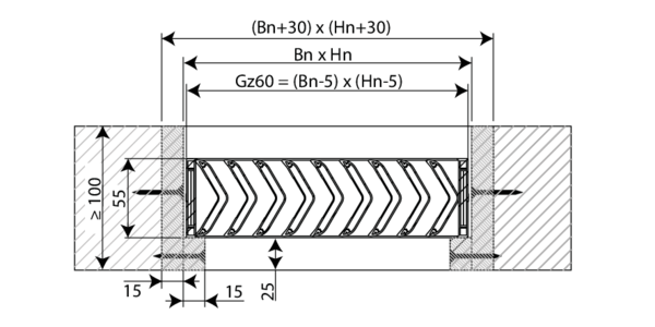 - Cellenbeton ≥ 100 mm | EW 60 (ho i o) | Niet van toepassing | Installatiemethode: ingebouwd, met lamellen horizontaal | 100x100 mm ≤ GZ60 ≤ 800x400 mm