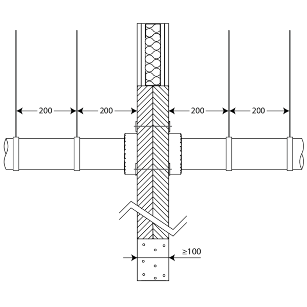 • Ondersteuning van de leiding is noodzakelijk om een functionele werking van de afdichting te garanderen in geval van brand. De leidingen moeten ondersteund en bevestigd worden volgens de regels van goed vakmanschap. Hiervoor verwijzen we naar de voorschriften van de fabrikant van de leidingen.
