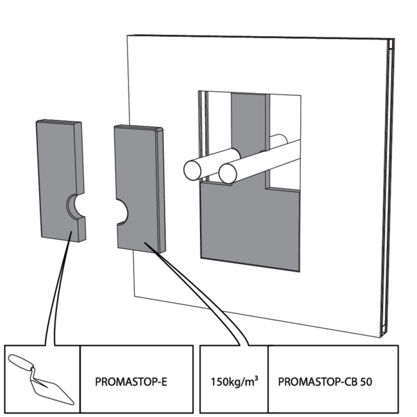 Bevestig een harde steenwolplaat van min. 50 mm dikte die eenzijdig voorzien is van brandwerende coating (type PROMASTOP-CB 50) rondom de manchetten. Gebruik een zaag/mes om de steenwol op maat te snijden. Smeer de kopse kanten van de steenwol alsook de voegen in met endotherme vulpasta (type PROMASTOP-E).