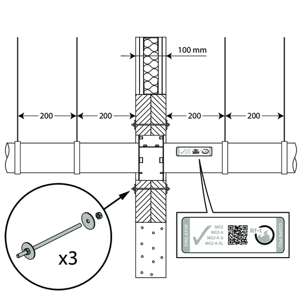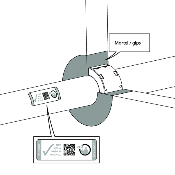 • Ondersteuning van de leiding is noodzakelijk om een functionele werking van de afdichting te garanderen in geval van brand. De leidingen moeten ondersteund en bevestigd worden volgens de regels van goed vakmanschap. Hiervoor verwijzen we naar de voorschriften van de fabrikant van de leidingen.
