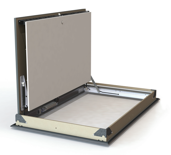 Esthetisch rookbeheersingsluik voor montage in de onderste horizontale wand van een rookbeheersingskanaal.