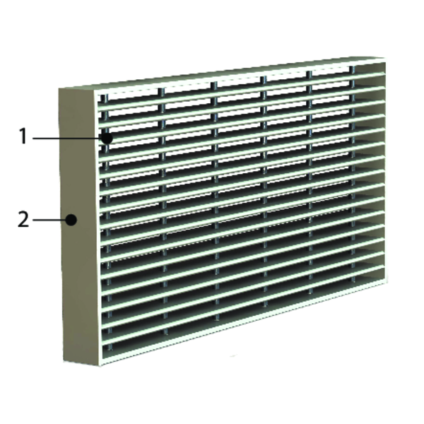 Rechthoekig doorkijkrooster met een brandweerstand van 60 minuten in massieve wand. Door hun neutraal aspect zijn deze roosters bij uitstek geschikt voor de natuurlijke ventilatie van technische lokalen.