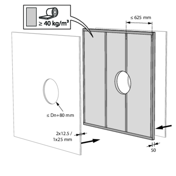 In de opening rond de kleppen (Dn + 50 mm) wordt de ruimte tussen de gipskartonnen platen gevuld met steenwol met een minimale dichtheid van 40 kg/m³.