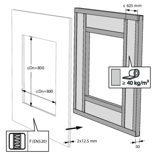 - Metal stud gipsplatenwand Type A (EN 520) ≥ 100 mm | EI 60 (ve i o) S - (500 Pa) | Steenwol ≥ 40 kg/m³ + afdekplaten | Installatiemethode: ingebouwd, 0-360°. Minimum afstand toegestaan met as tot 45°. | Ø 100-250 mm