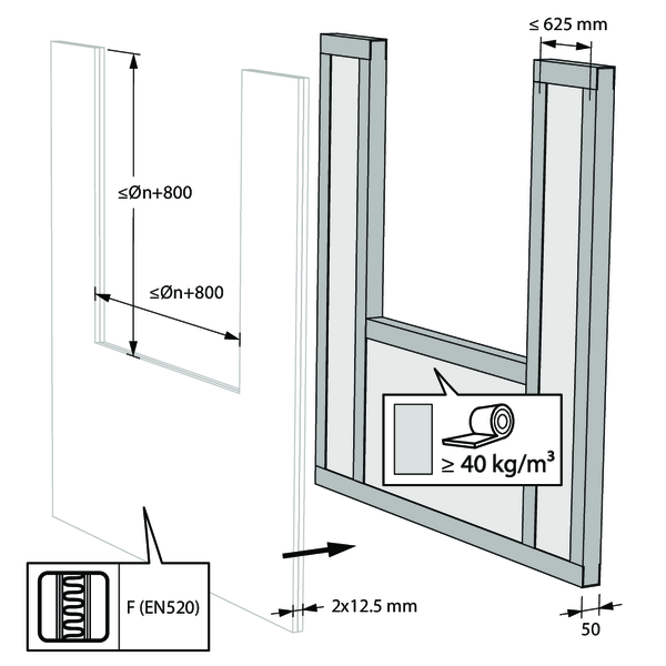 - Metal stud gipsplatenwand Type F (EN 520) ≥ 100 mm | EI 90 (ve i o) S - (500 Pa) | Gips | Installatiemethode: ingebouwd, 0-360°. Minimum afstand toegestaan met as tot 45°. | Ø 100-315 mm