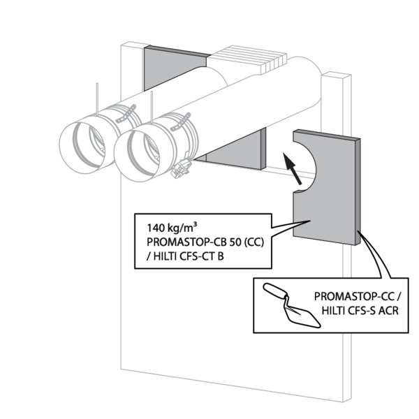 De opening rond het kanaal in de wand wordt afgedicht met gecoate steenwol platen type Promastop CB(/CC) / Hilti CFS-CT B « G ». De randen worden afgedicht met PROMASTOP-CC / HILTI CFS-S ACR coating waardoor de platen vast zitten.