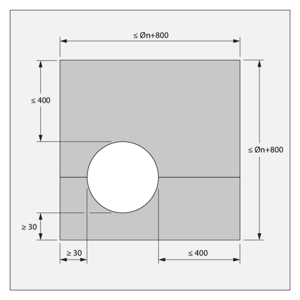 De brandklep moet niet centraal in de opening (met maximale afmetingen Ø brandklep + 800 mm) geplaatst worden. De afstand tussen de brandklep en de rand van de opening is maximaal 400 mm.