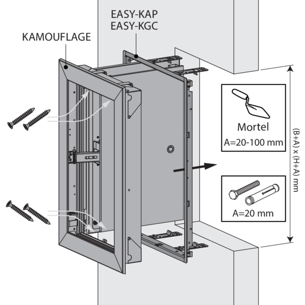 Bij vastschroeven van het inbouwkader (opening met afmetingen tot (B+20) x (H+20) mm):