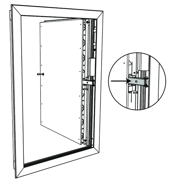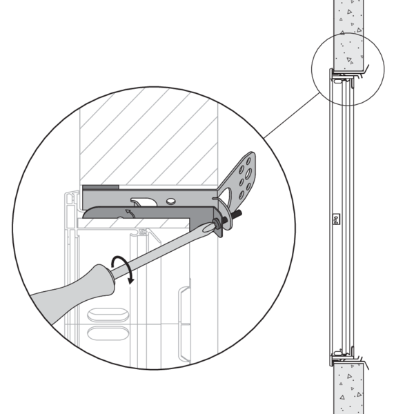 Schroef het luik vast op het inbouwkader met de 4 meegeleverde schroeven, zoals aangegeven op de tekening. Bij het aandraaien van de schroeven wordt het luik tegen de wand aangedrukt. Het is ook mogelijk om de hoek van het luik t.o.v. het inbouwkader licht te corrigeren.