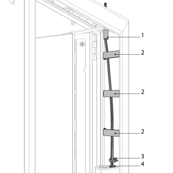 Voer de bedrading door de geboorde opening. Gebruik de meegeleverde beschermmouw (1), clipsen (2) en trekontlasting (3) om de bedrading te bevestigen aan het kader. Voer de bedrading door de tule (4) in het aansluit compartiment en sluit aan volgens het aansluitschema.