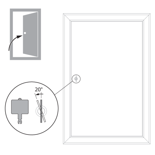 Schroef het luik vast op het inbouwkader met de 4 meegeleverde schroeven, zoals aangegeven op de tekening. Bij het aandraaien van de schroeven wordt het luik tegen de wand aangedrukt. Het is ook mogelijk om de hoek van het luik t.o.v. het inbouwkader licht te corrigeren.