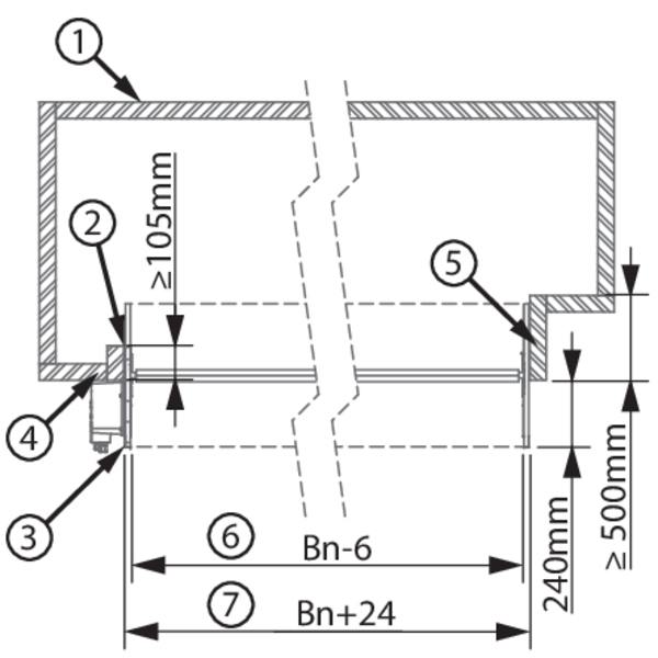 Plaats een kraag uit hetzelfde materiaal en dezelfde dikte als het kanaal (dikte e) met een diepte van minimum 105 mm in de opening.