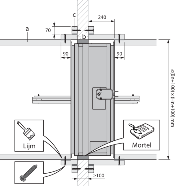 Plaats het rookbeheersingskanaal (a) tegen de flens van de klep. Een frame (b), gemaakt van hetzelfde materiaal, verbindt het kanaal met de muur. Dit frame heeft een overlap op het kanaal van minimaal 90 mm. Bevestig het frame aan het kanaal met schroeven (ø5x90 mm) om de 150 mm en bijhorende kanaallijm. Een tweede frame (c) van 70 mm hoogte, gemaakt van hetzelfde kanaalmateriaal, wordt tegen de muur geschroefd met schroeven geschikt voor die toepassing.