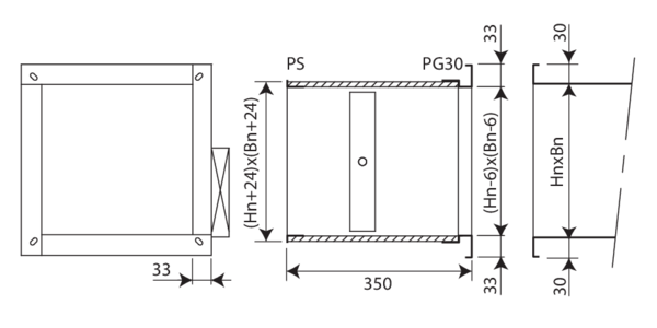 PG30 - Anslutning till kanaler med 30 mm flänsar (antingen med gejdskena eller med skruvar). Även möjlig på schaktsidan istället för PS-anslutning (vid beställningen). Elliptiska hål Ø 8,5 x 16 mm.