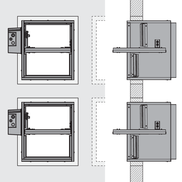 Rökkontrollspjällen kan installeras på minimalt avstånd ovanpå eller bredvid varandra, förutsatt att de är monterade i separata hylsor tillverkade av kanalmaterial med erforderligt brandmotstånd. Det rekommenderas att inte överskrida en konfiguration på 2 x 4 (Höjd x Bredd).
