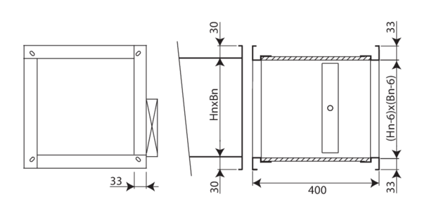PG30 - Anslutning till kanal med 30 mm fläns (antingen med gejdskena, bultar, eller med klämmor. Ovala hål Ø 8,5 x 16 mm.